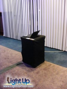 Controlling your experience... From what will be considered the top left corner of the floor (orientation is only important for videos), a bundle of control and power cables will connect the dance floor to its control center, which is either placed upon a small 18 inch square table (pictured in the top left of the photo) or on a banquet table supplied by the facility. The control center must be within 8 feet of the corner of the floor. A 110 volt power source is then connected to the control center. The command center is where a technician sits or stands to control what is displayed on the floor at any given point.