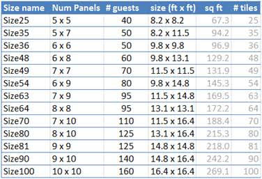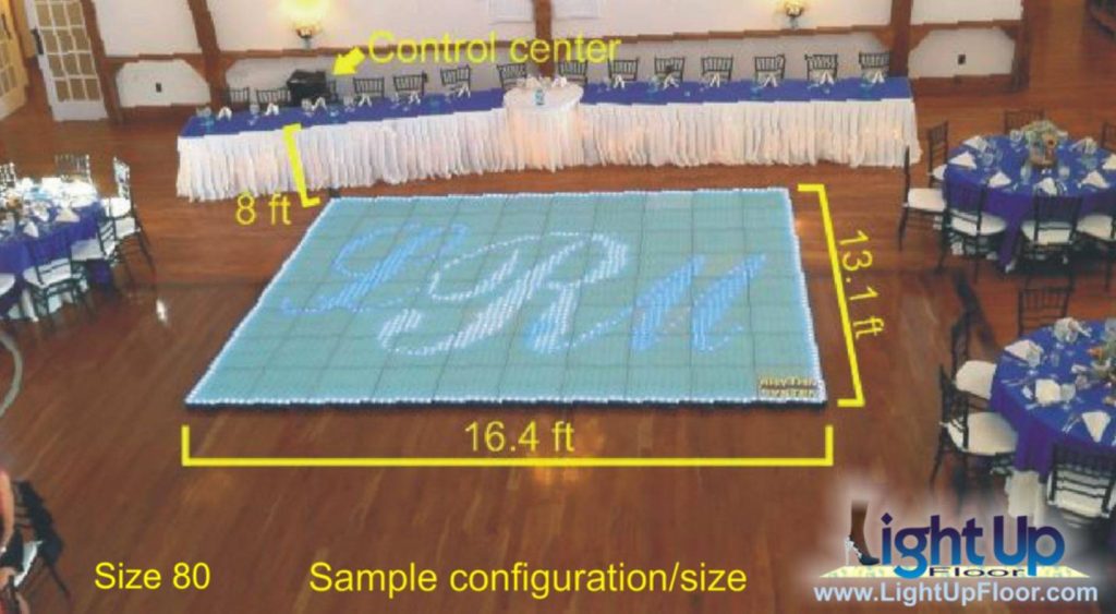Sizes... Pictured above is digital video dance floor that is 16.4ft x 13.1ft. This size is appropriate for approximately 125 guests at a typical event. Approximately 40 guests can comfortably fit on this size at any time but because not all guests will want to be on the floor at the same time, most events don't need a floor that can handle all guests at once. Many events include space around the interactive LED dance floor, as shown above, for occasional overflow. A square or rectangular configuration can be installed up to 16.4' x 14.8'. Note that we are no longer offering size100 (16.4' x 16.4') in the interactive dance floor but do now offer a non-interactive black top pixel dance floor in larger sizes.